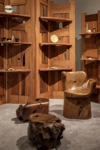 Blunk Space’s Rio Kobayashi CommissionBlunk Space, the gallery established by the estate of the pioneering Northern Californian artist JB Blunk, commissioned the London-based designer Rio Kobayashi to channel the late creative’s home. Kobayashi, in turn, created salvaged redwood shelving units and a bench, replete with yet more biological but regimented lines. The rosy glow of their beauty is almost magnetic, and Kobayashi’s output caught the attention of the powers that be: Blunk Space has been awarded Best Curio at this year’s fair.